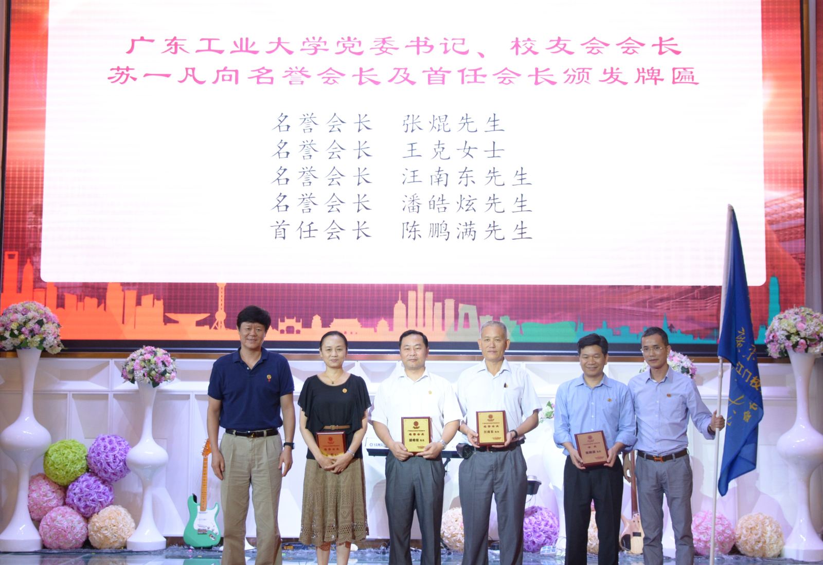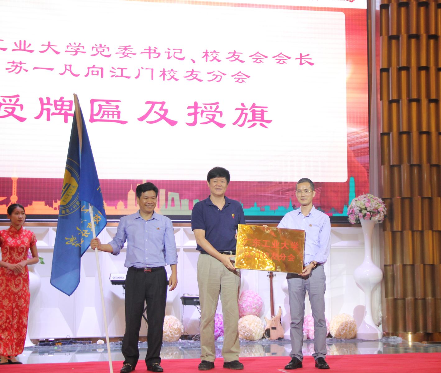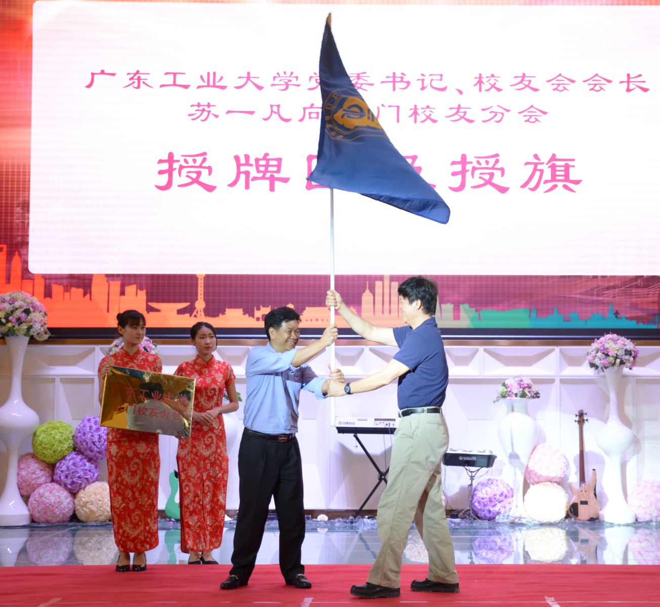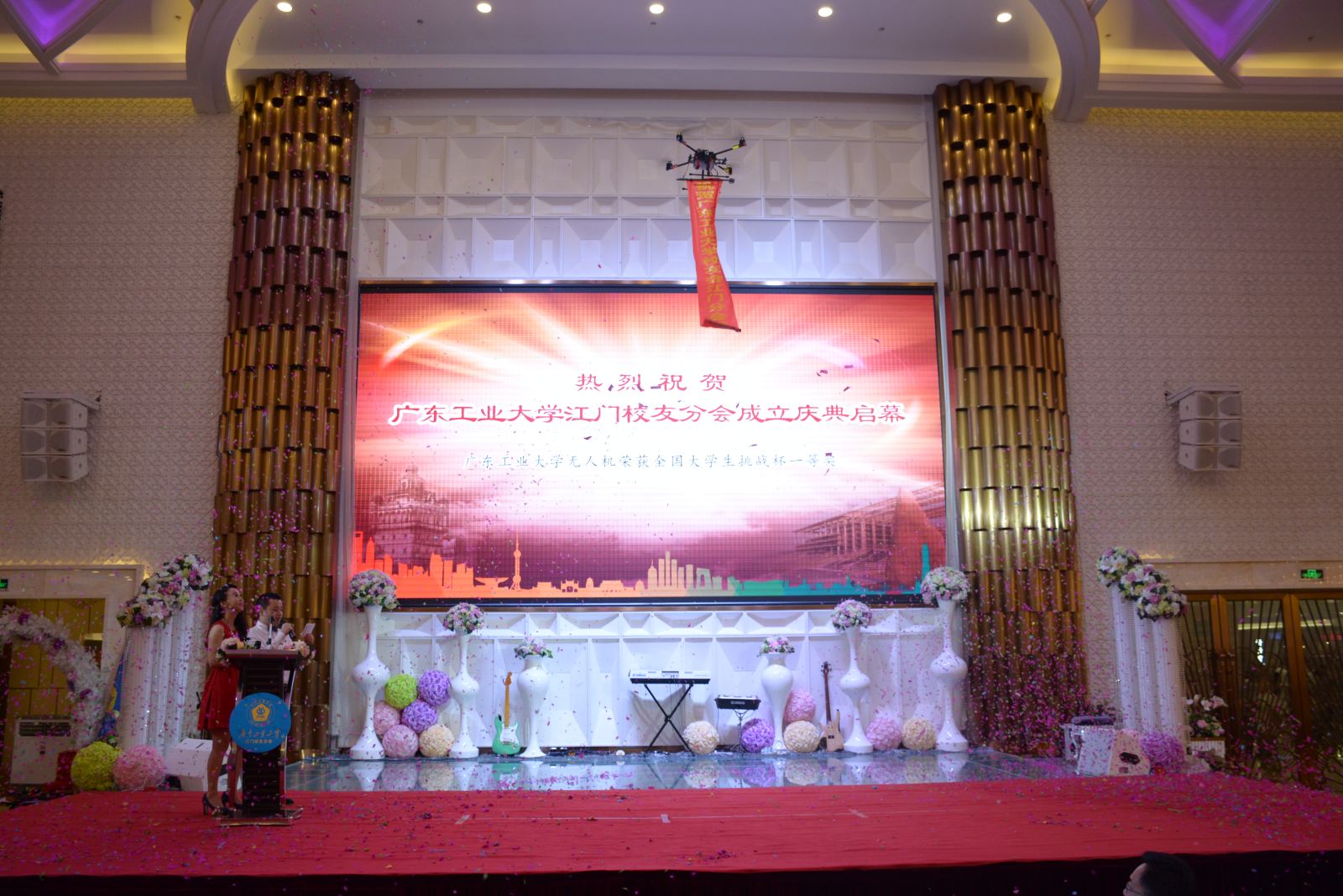 在庆典上,苏一凡书记为校友分会授牌、授旗,并为江门校友分会理事会成员颁发聘书。随着我校挑战杯一等奖作品——无人机的飞升,江门校友分会成立的字幅在空中展开,标志着江门校友分会正式成立。