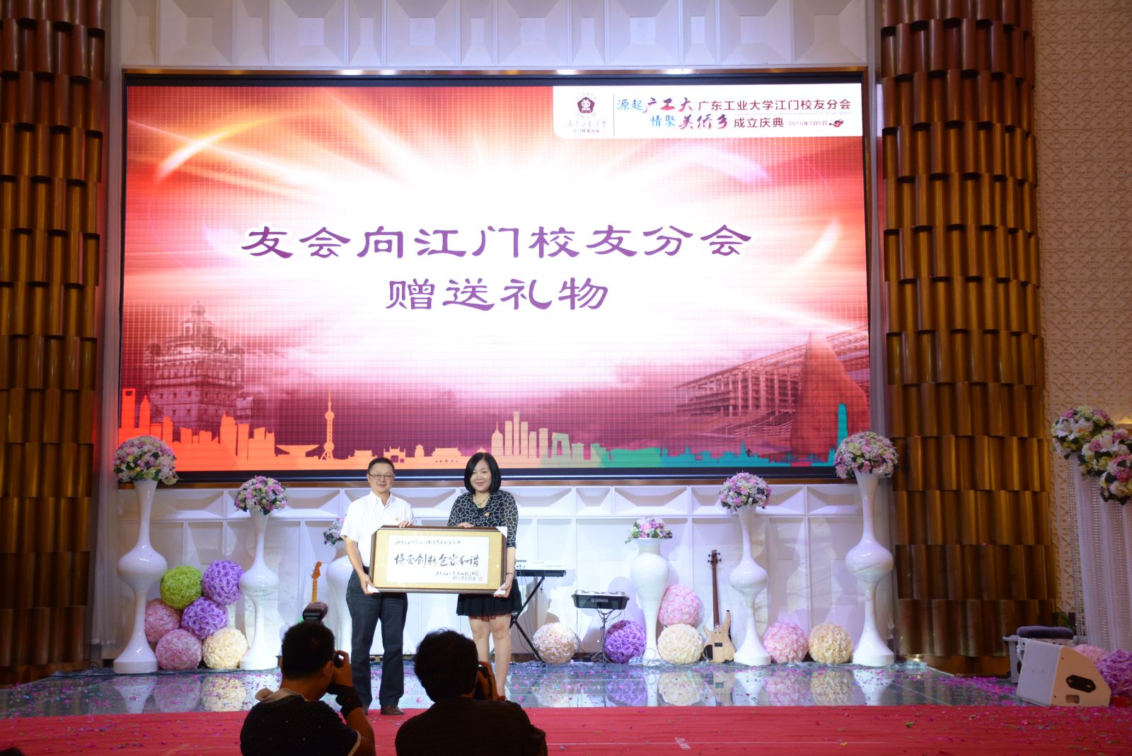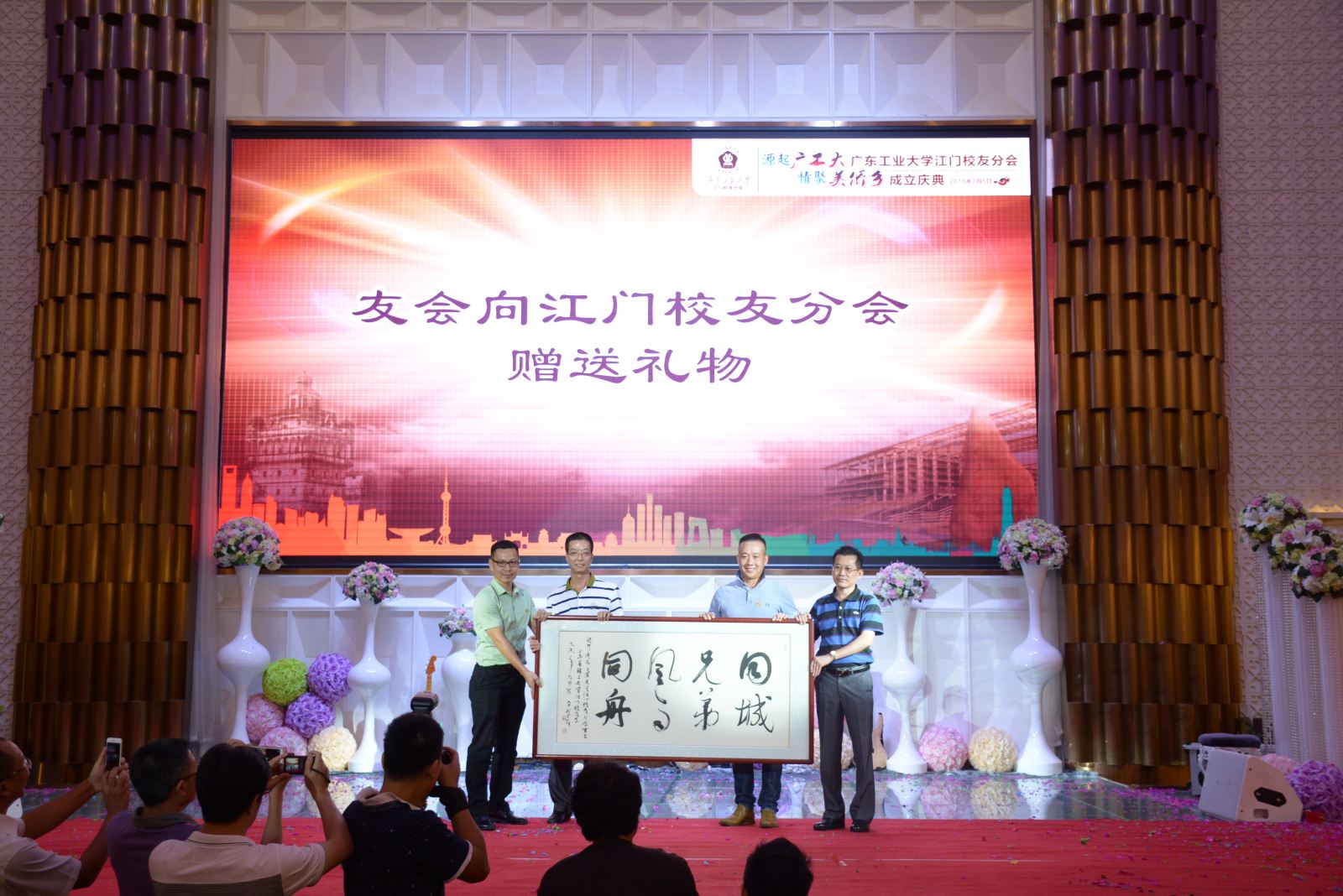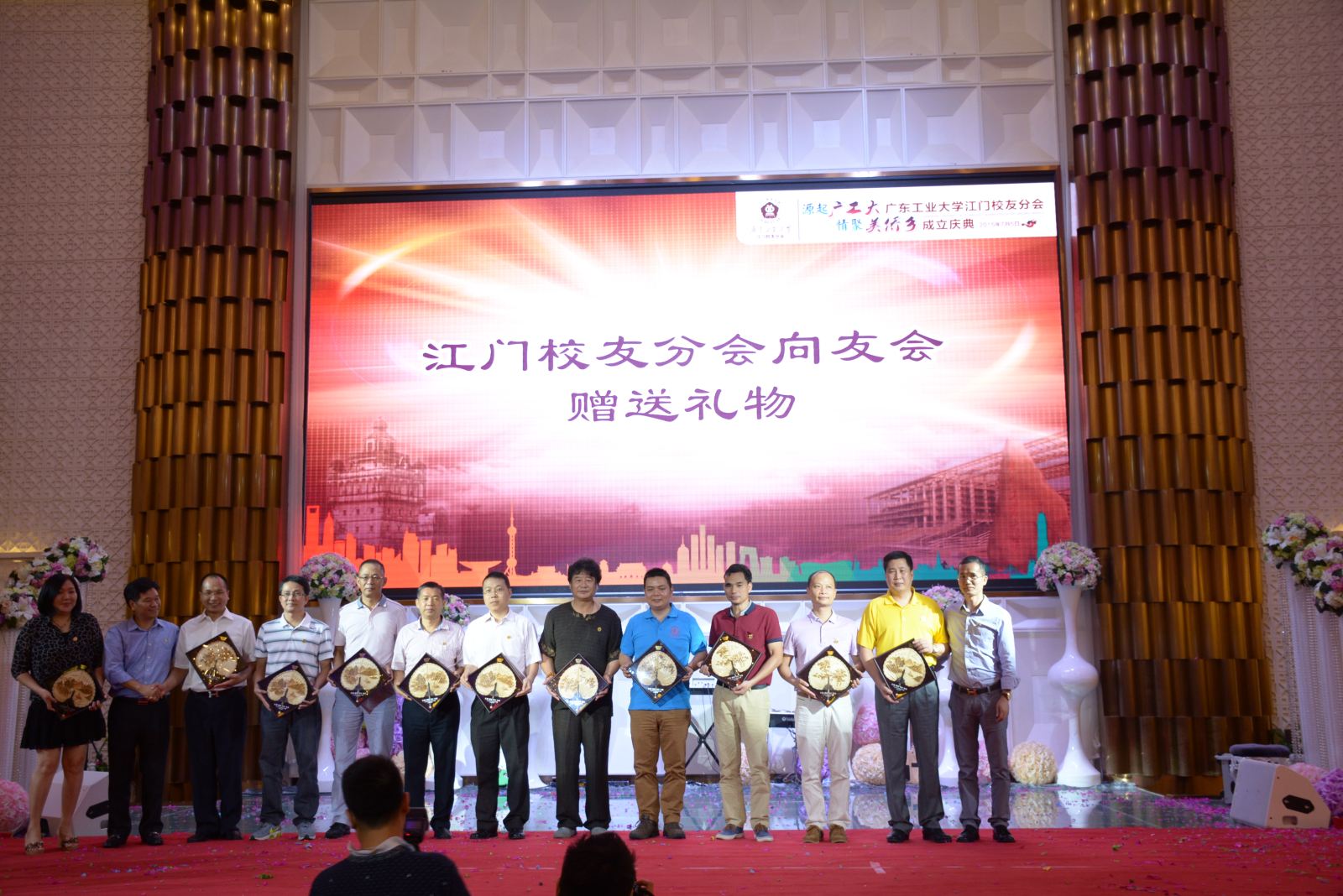 在庆典上,江门校友分会向母校、兄弟校友会赠送了国家级非物质文化遗产——新会葵扇,表达对母校的感恩之情以及对兄弟校友会的同窗情谊;惠州、中山、东莞、韶关等地校友分会及华工江门校友分会也向江门校友分会赠送了礼品,祝贺江门校友分会成立。