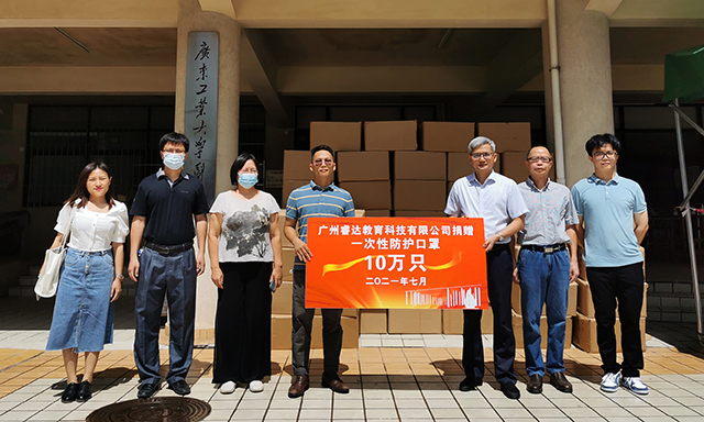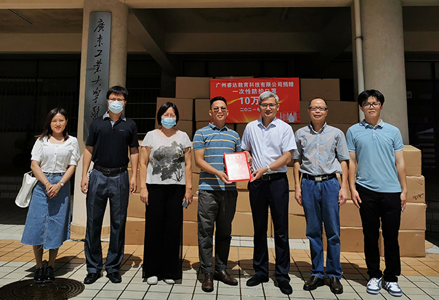 7月8日,广州睿达教育有限公司向我校捐赠一次性防护口罩10万只,支持我校疫情防控工作。学校新型冠状病毒感染的肺炎疫情防控工作领导小组常务副组长、党委常委、副校长陈卓武代表学校在大学城校区接受了捐赠。学校疫情防控领导小组成员单位学校医院负责同志、对外联络与校友事务办公室负责同志等参加捐赠仪式。这些防护物资,将由学校医院调配用于校园疫情防控工作。