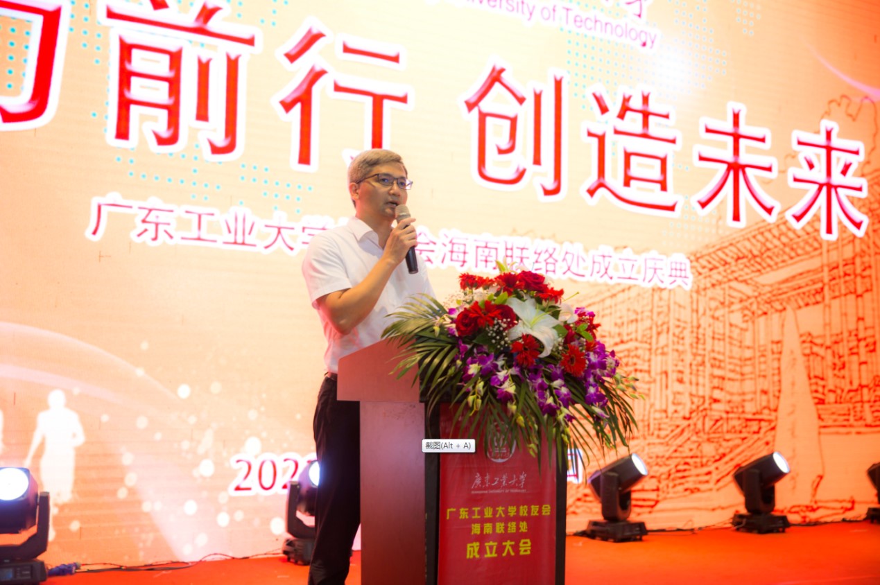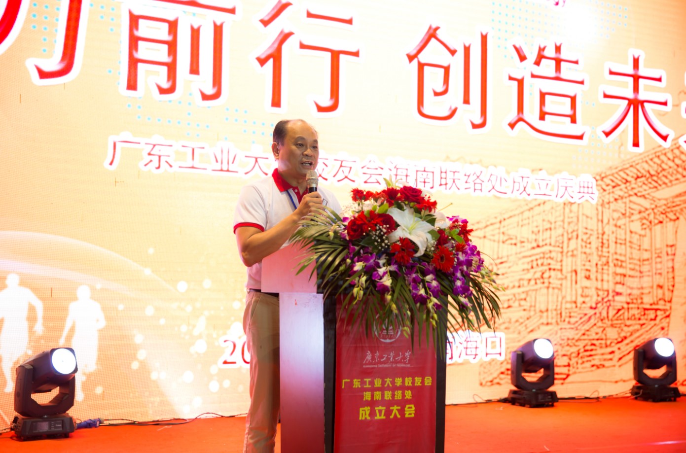 在成立庆典大会上,陈卓武副校长代表学校和学校校友会向海南校友会的成立表示热烈的祝贺,向所有在海南工作、生活的校友表示诚挚问候和美好祝福,并对筹建作出无私奉献的校友们表示衷心的感谢。他说,学校自1958年开办本科教育以来,始终扎根南粤,坚守“为党育人、为国育才”初心使命,传承“团结、勤奋、求是、创新”校训,秉持“与广东崛起共成长,为广东发展作贡献”的办学理念,为国家和社会培养了40余万英才俊杰,为经济社会发展提供了有力的人才支撑,为海南省的社会经济建设作出了积极贡献。他向校友们介绍了学校近年来取得的成绩和学校“三步走”发展战略。他希望海南校友会要坚持以服务校友为宗旨,全面加强组织自身建设,团结校友,让广大校友紧紧依靠校友会这一平台,彼此关心、相互支持,实现共同发展;希望广大校友继续传承和弘扬广工精神,紧跟时代步伐,敢于挑战、勇于担当、甘于奉献,在服务经济社会发展中建功立业,实现人生理想和价值;希望校友们加强与母校的联系,关心支持母校发展,携手实现校友、母校事业共同发展。